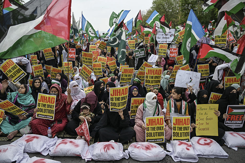If you want to disarm Hamas and other Palestinian terror groups and promote peace and coexistence between Palestinians and Israelis, Pakistan is the wrong choice. Pictured: Supporters of the Jamaat-e-Islami party, at an anti-Israel protest that drew tens of thousands of people, hold signs reading "Jihad is the only solution" and "We are Hamas," in Islamabad, Pakistan on April 20, 2025. (Photo by Aamir Qureshi/AFP via Getty Images)